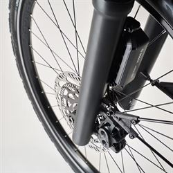 Rammen er bygget i high-performance hydroformet aluminium, som kombinerer lav vægt med høj styrke. Det gør cyklen robust nok til tunge ryttere og masser af bagage – uden at føles klodset. Kablerne er ført smart gennem stellet, så udtrykket bliver rent og moderne, og du undgår snavs og slid på kablerne.