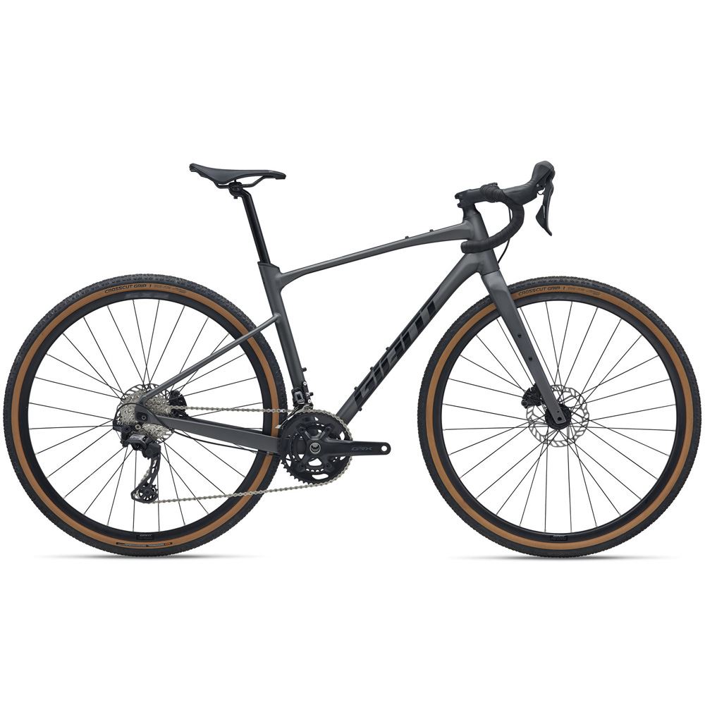 Drivlinjen er den nye 12-speed Shimano GRX i 2x-opsætning: RX-610 skiftegreb kombineret med RX-820 forskifter/bagskifter, Shimano RX-610 kranksæt i 30-46T og en Shimano 105 11-34T kassette. Resultatet er et bredt gearområde til både stejle bakker og flade strækninger. Bremsekraften håndteres af Shimano GRX hydrauliske skivebremser med 160 mm Giant MPH-rotorer for ensartet, kontrolleret bremseeffekt i vådt og tørt. Giant alloy-hjul med 12 mm thru-axles og Giant Crosscut Grip TR 700x40c tubeless-dæk giver greb og lav modstand – med plads til at gå op i volumen takket være flip-chip-systemet, der åbner for dækbredder op til 53 mm.