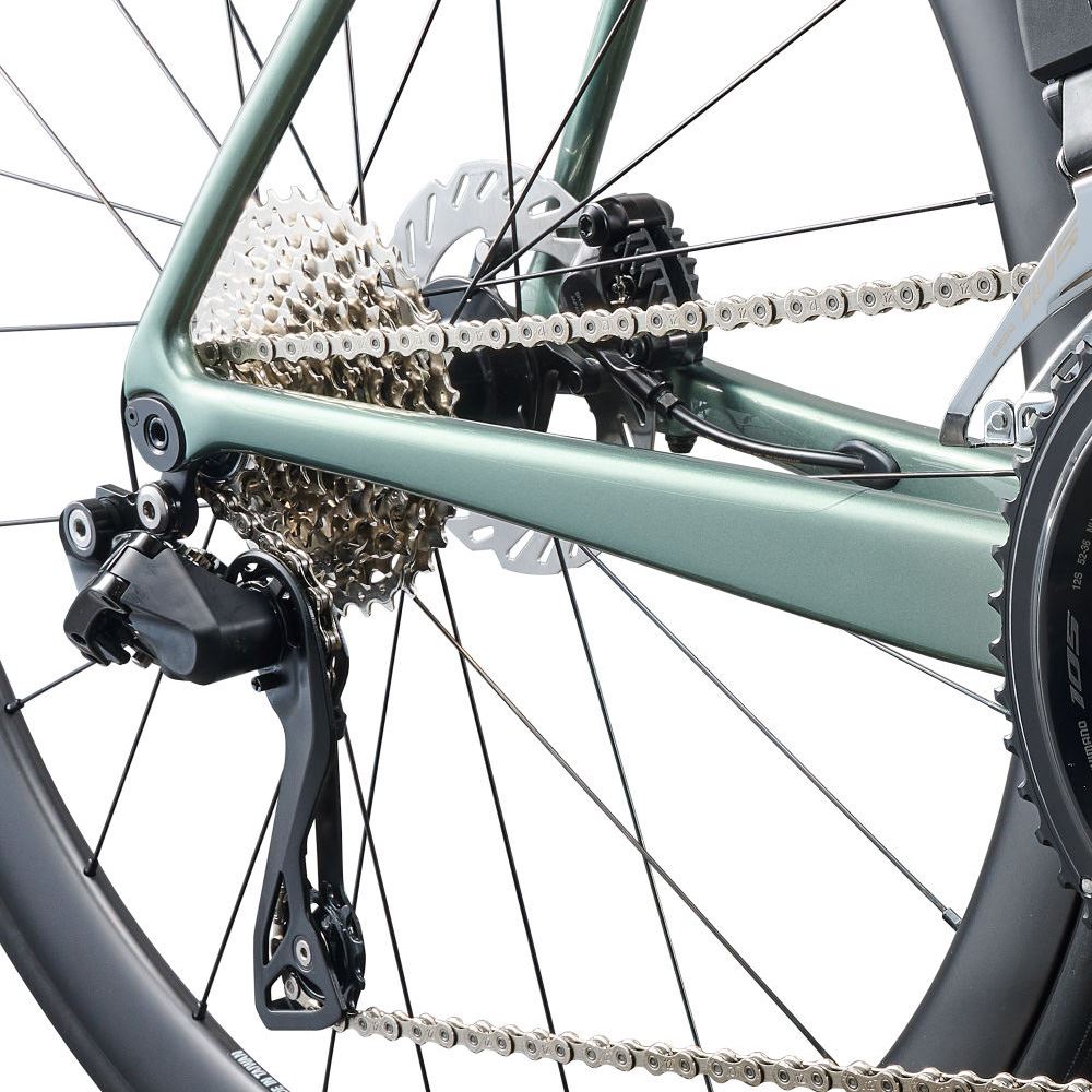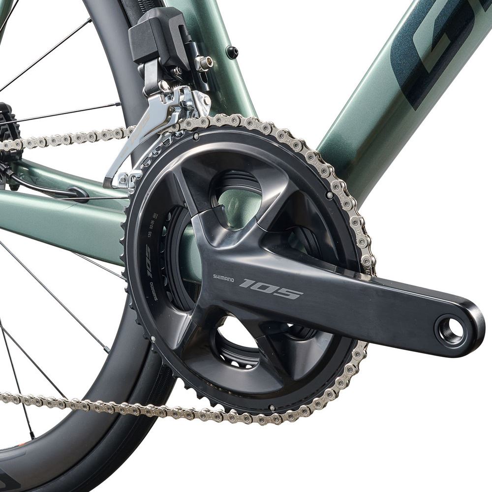 Stellet i Advanced-Grade Composite er konstrueret med fokus på systemoptimering: ramme, hjul og cockpit er udviklet til at arbejde sammen, så du får mere ud af hvert eneste watt. Aeroprofileringen er finpudset via CFD-beregninger og vindtunneltest, fra de afkortede ellipseprofiler i rørene til integrationen omkring frempind, spacere og topcap. Forgaflen er ligeledes i Advanced-Grade Composite med fuld-composit OverDrive-styrfitting, der giver præcis styring, når tempoet stiger. Lette carbonhjul med Giant Gavia Course 1 tubeless-dæk i 700x28C giver et hurtigt og sikkert vejgreb. Den elektroniske Shimano 105 Di2-gruppe sørger for konsistente, knivskarpe gearskift under belastning, og de hydrauliske skivebremser leverer pålidelig bremsekraft i al slags vejr. Kassette i 12-speed 11-34 og et 36-52-kranksæt giver et bredt gearområde til både bakker og flad vej. Maksimal dækfrigang er 33 mm, så du har plads til lidt mere volumen, hvis du ønsker ekstra komfort.