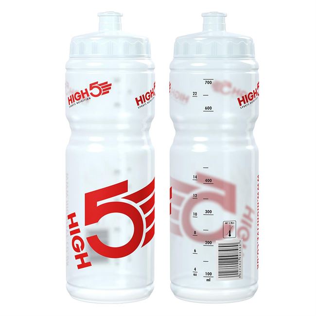 En High5 drikkedunk er fremstillet af et hygiejnisk materiale, som kan tåle at blive vasket i opvaskemaskinen. Flasken er gennemsigtig, og den har skruelåg. En praktisk bidetud gør det nemt at åbne og lukke flasken under kørsel.