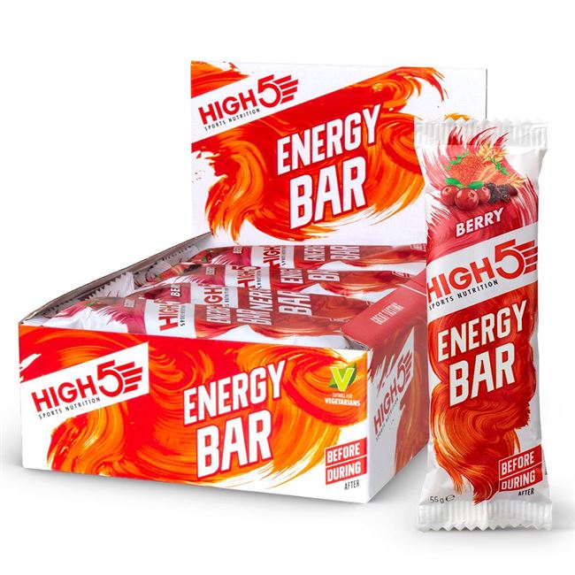 High5 Energybar er fremstillet af havre og 49% tørret frugt. Den har en mild og naturlig smag af bær. Energibaren har både langsomt og hurtigt optagelige kulhydrater med en kombination af det høje frugtindhold og sunde korn.