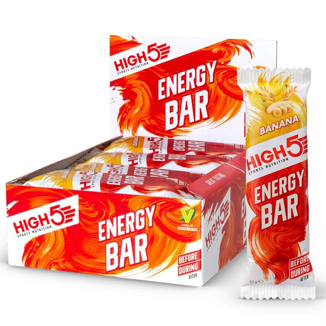 High5 Energybar er fremstillet af havre og 49% tørret frugt. Den har en mild og naturlig smag af banan. Energibaren har både langsomt og hurtigt optagelige kulhydrater med en kombination af det høje frugtindhold og sunde korn.