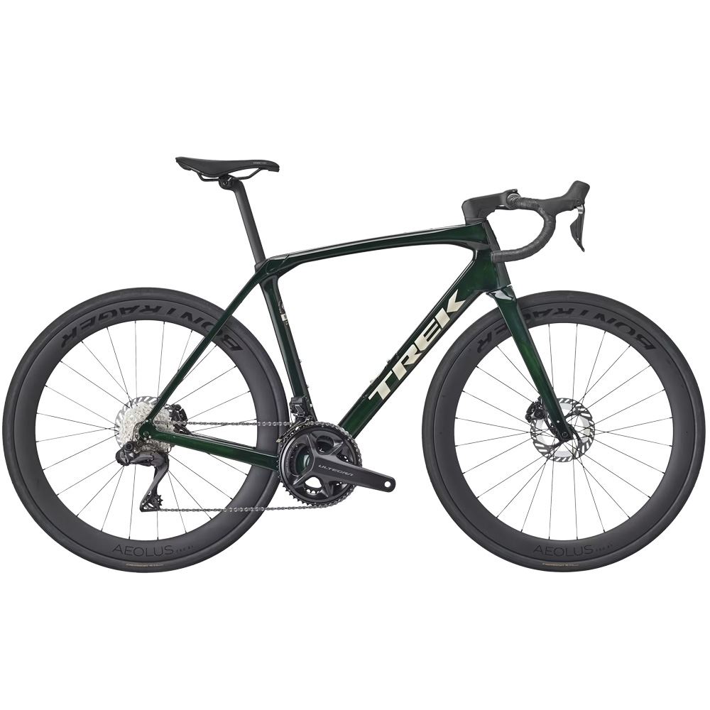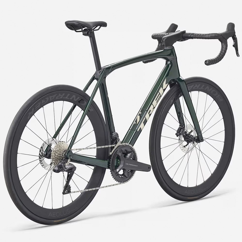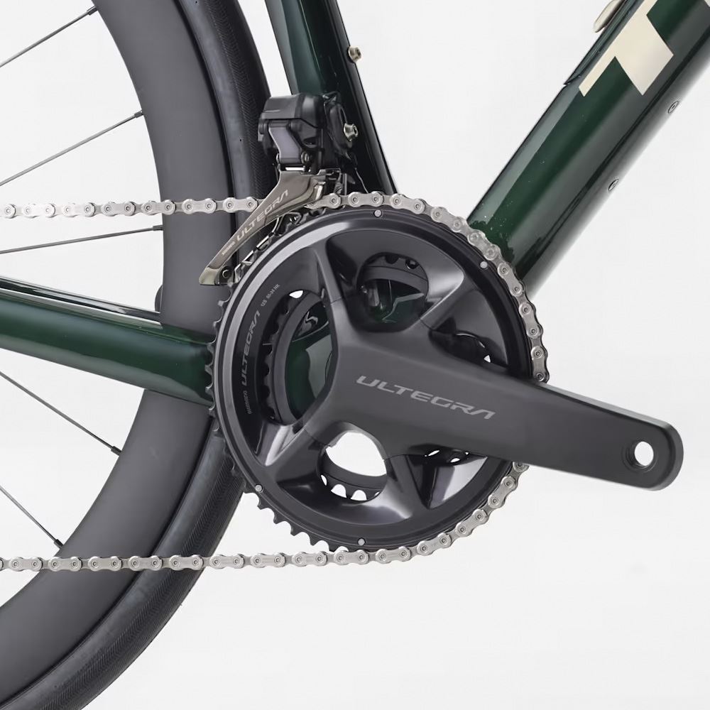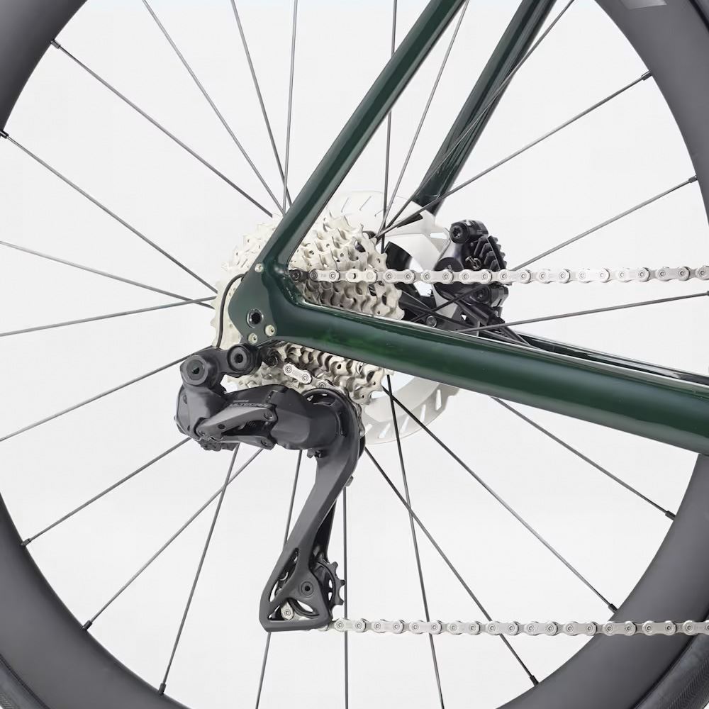 Drivlinjen er komplet Ultegra Di2 med R8150 forskifter og bagskifter for elektroniske, præcise gearskift. Kompakt R8100-kranksæt kombineret med en 11-34 kassette giver et bredt gearområde til alt fra stejle bakker til flade føringer, mens en M8100-kæde binder sættet sammen. Hjulene er Bontrager Aeolus Pro 51 i kulfiber, og de er sat op med Bontrager Kwaremont Pro TLR 700x32 mm foldedæk – klar til tubeless og klar til at levere både komfort og hastighed på lange stræk.