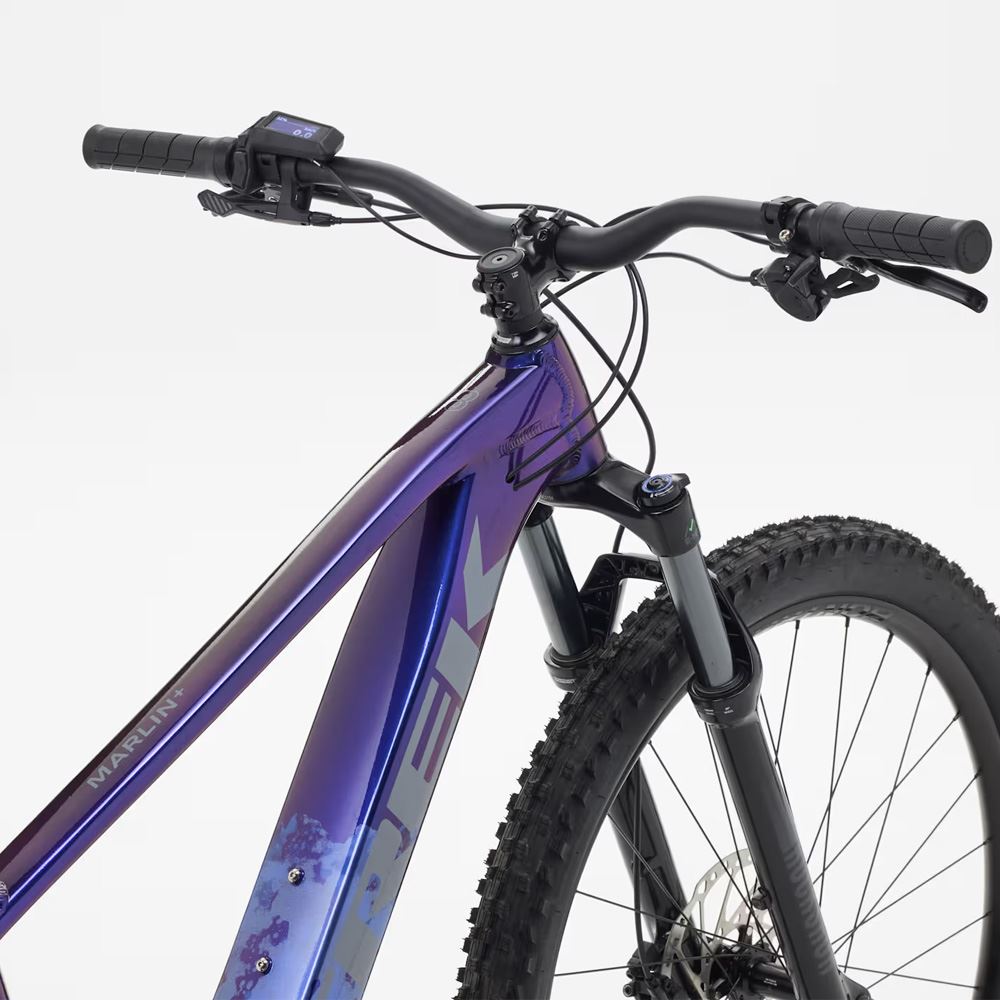 Forside / Cykler / Elcykel / Elmountainbike ‹ › Beskrivelse Specifikationer Trek mountainbike elcykel med Bosch motor. Trek Marlin+ 8 er en moderne el-mountainbike designet til både nybegyndere og erfarne ryttere. Denne hardtail e-MTB kombinerer kraftfuld el-assistance, robuste komponenter og høj komfort – perfekt til både skovstier, grusveje og daglig pendling. Trek Marlin+ 8 er udstyret med en driftssikker Bosch Active Line Plus-motor, der leverer op til 50 Nm moment og hjælper dig ubesværet op ad bakker og gennem krævende terræn. Med et integreret 400 Wh batteri får du en solid rækkevidde, så du kan køre længere ture uden bekymringer. Denne el-mountainbike er bygget til performance: 12-speed Shimano Deore gearsystem for præcise og hurtige skift Hydrauliske skivebremser for maksimal kontrol i alle forhold Luftaffjedret forgaffel (120 mm vandring) for komfort på ujævnt underlag Dropper post, så du nemt kan justere sadelhøjden under kørsel Trek Marlin+ 8 er ikke kun en trailcykel – den er skabt til alt: Ideel til skov, grus og let MTB Perfekt som pendlercykel med beslag til skærme og bagagebærer Komfortabel geometri og let aluminiumstel Et oplagt valg for ryttere, der vil have én cykel til det hele. Derfor skal du vælge Trek Marlin+ 8: Kraftig Bosch motor med naturlig assistance Perfekt balance mellem pris og performance Klar til både trail og hverdagsbrug Høj byggekvalitet fra Trek Motor: Bosch Active Line Plus, 25 km/t, 50 Nm Batteri: Bosch CompactTube 400 Wh Walk-assist: Ja Kontroller: Bosch Purion 200 Oplader: Bosch 2A Stelmateriale: Alpha Gold aluminium Farver: Purple Flip - Fury Red Forgaffel: RockShox Recon Silver RL Air, 120 mm Hjul: 29" (27.5" på S) Bontrager Line TLR Dæk: Bontrager Gunnison Pro XR, 29x2,6" (S: 27,5x2,6") Kranksæt: FSA CK-220, 32T Gearvælger: Shimano Deore M6100, 1x12 gear Bagskifter: Shimano Deore M6100 Kassette: Shimano Deore M6100, 10-51T Kæde: Shimano Deore M6100 Bremser: Shimano MT4100 greb, MT420 caliper, hydrauliske skivebremser Sadel: Bontrager Verse P3 Sadelstang: TranzX JD-YSP18 dropper post Styr: Bontrager aluminium Frempind: Bontrager aluminium Pedaler: VP-536 (uden kliksystem) Vægt: Ca. 21.8 kg Rækkevidde/assistance afhænger af den valgte assistance, din egen ydelse, terræn, vind, temperatur og vægt mm. Varenr.: 5336225 Gratis fragt:Gratis fragt ved køb over kr. 349- (Gælder kun udstyr) Levering:Leveringstid 04-05-2026 Returret: 14 dage Reklamation:2 år Sikkerhed:Medlem af Danske Cykelhandlere Brug for hjælp?Skriv endelig til os, hvis du har spørgmål til denne vare Trek Marlin+ 8 - Purple SElmountainbike 2026 22499,- Tilvælg udstyr MTB pedaler Skærme Flaskeholder Gratis eftersyn Shimano PD-M520 389,00,- TilføjFjernIkke på lager SKS skærmsæt 26-27.5" 499,00,- TilføjFjernIkke på lager Trek Elite 149,00,- TilføjFjernIkke på lager Levering Click & Collect På lager online 100% køreklar - leveres direkte til døren Du kan afhente i én af vores 13 butikker 5-stjernede & certificerede værksteder Del dit køb op i 4 - 24 betalinger Ikke på lager MTB pedaler Ingen Shimano PD-M520 (389,00) Skærme Ingen SKS skærmsæt 26-27.5" (499,00) Flaskeholder Ingen Trek Elite (149,00) Trek Marlin+ 8 - Purple S DKK Ikke på lager Leveringstid 04-05-2026 trek 0